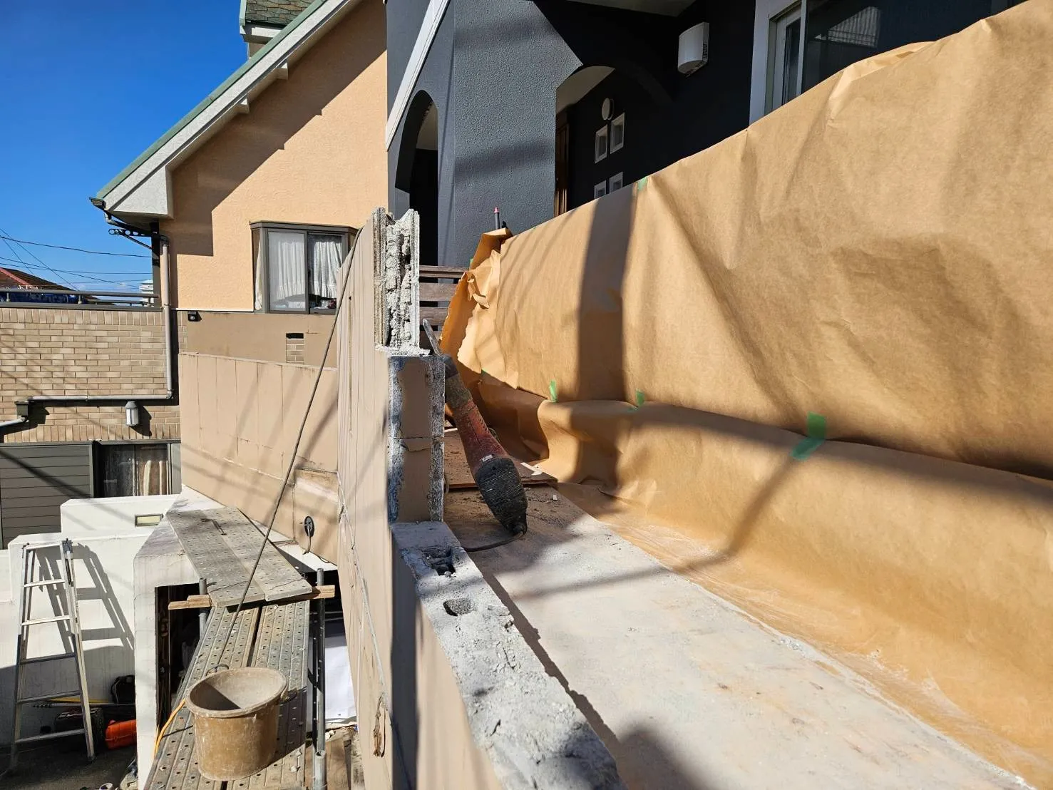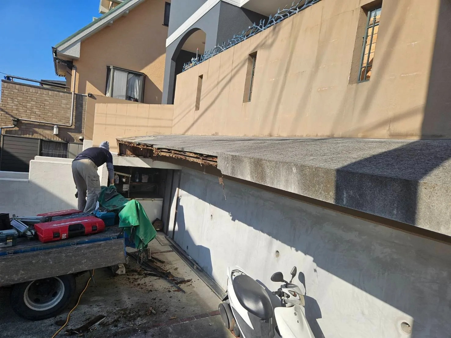既存の擁壁を解体して、建物の掃出しサッシから、ウッドデッキが造作されていて、そのウッドデッキと新規のカーポートの屋上を繋げる作業になります。先ずは、既存の擁壁と庇と一部ウッドデッキの解体を行います。