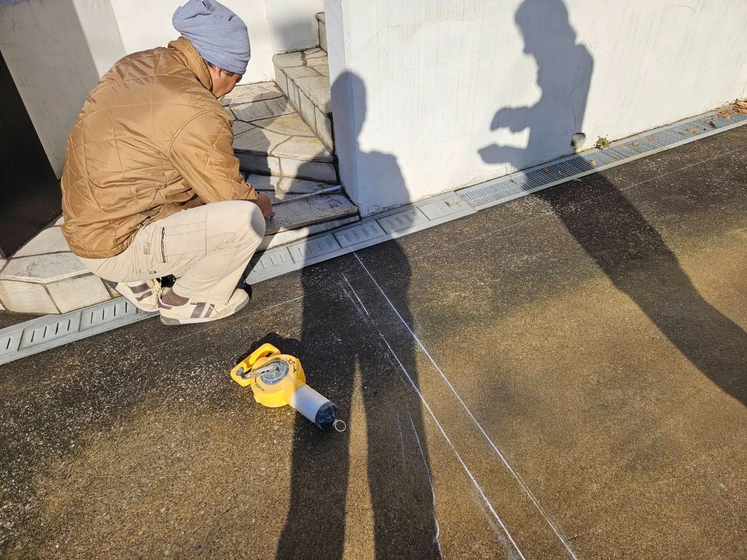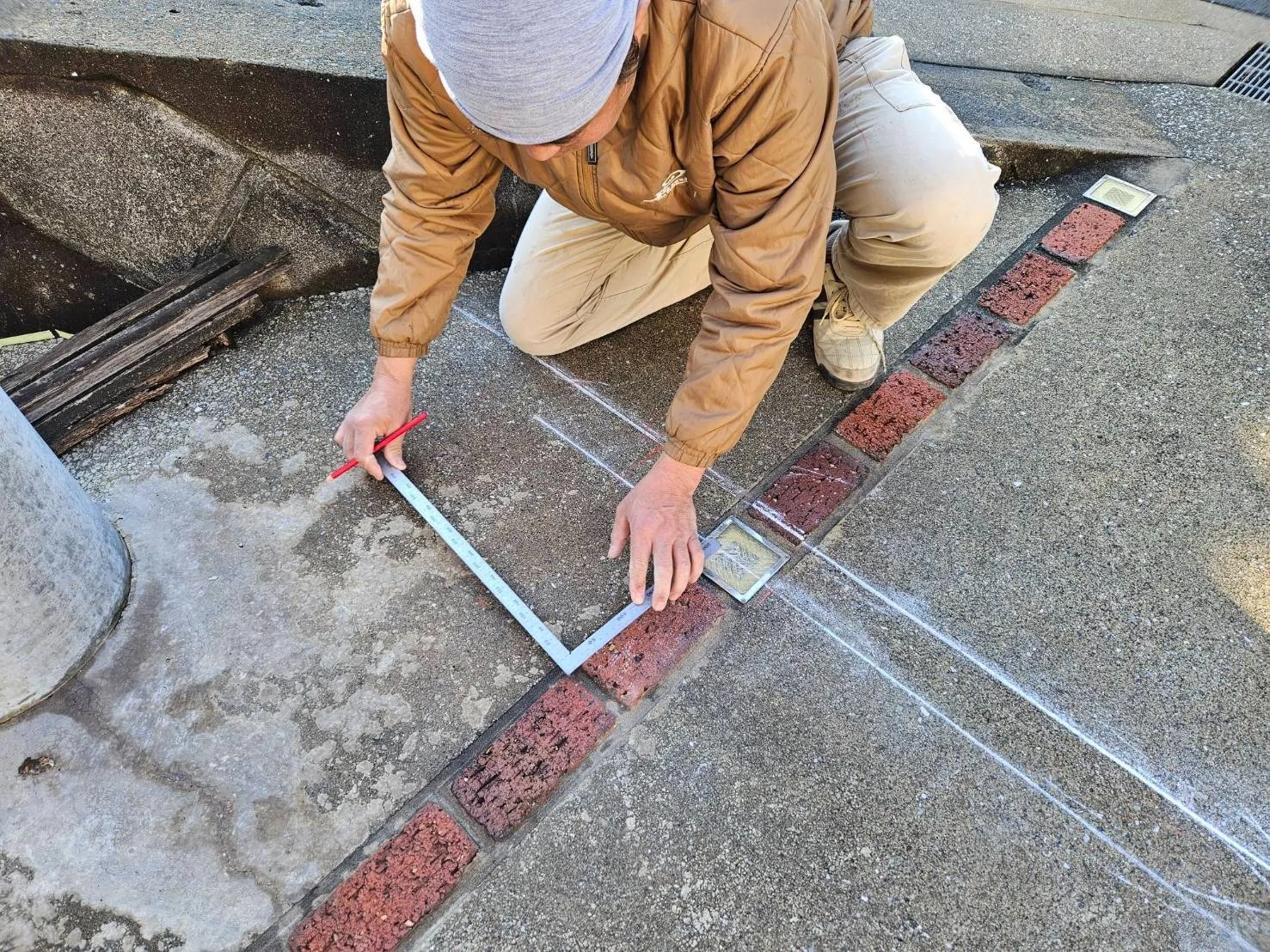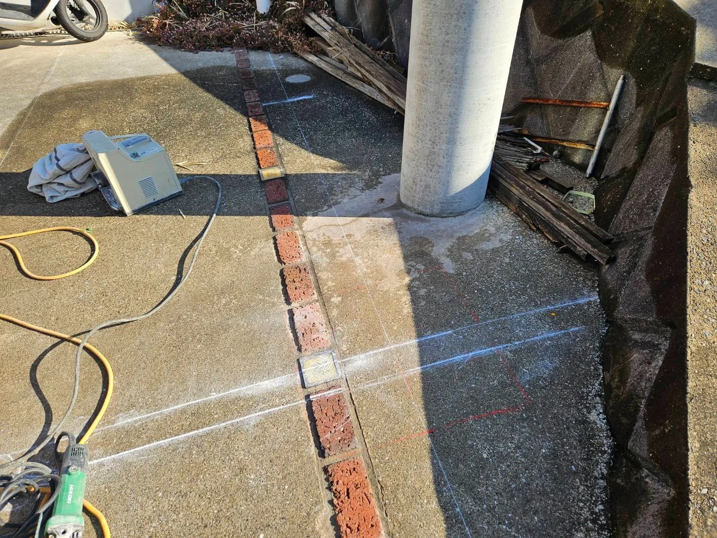 解体作業が終了し、準備は整いました。これより鉄骨組みの準備に入ります。柱を2箇所建てるため、墨出しをして、柱の基礎を作っていきます。先ずは墨出しです。