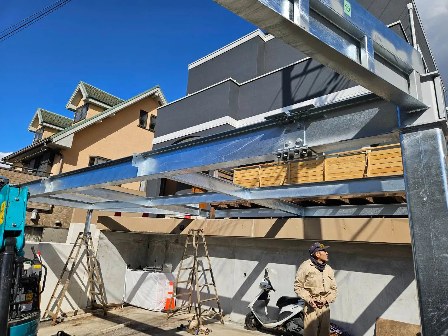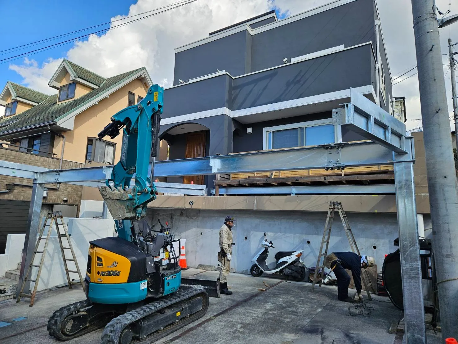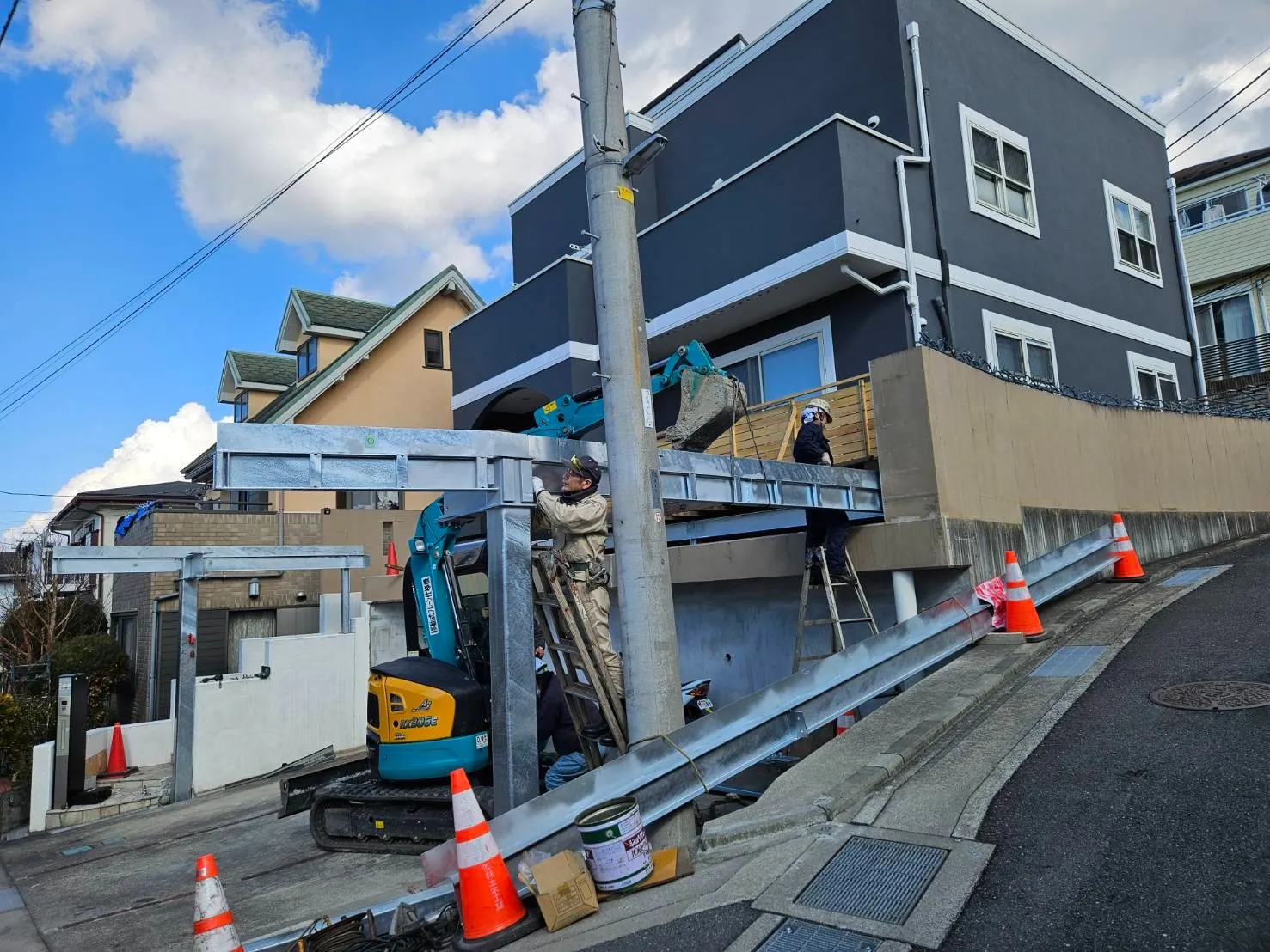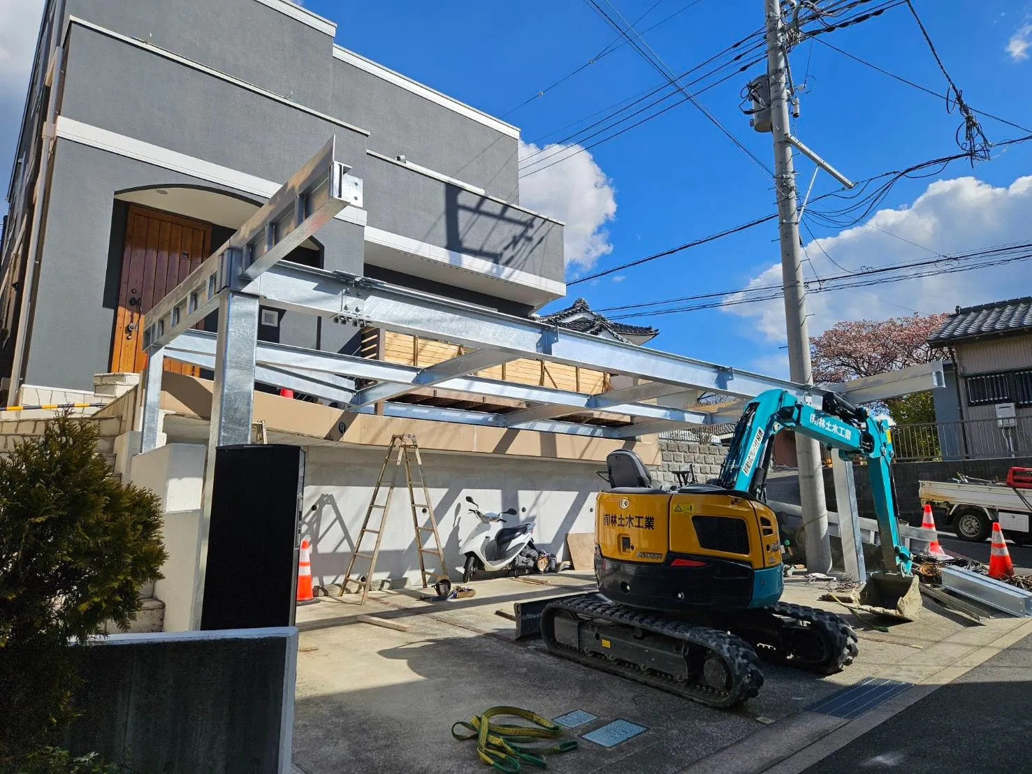以前塗装工事をさせていただいた顧客様邸の駐車場に、鉄骨でカーポートを造作していきます