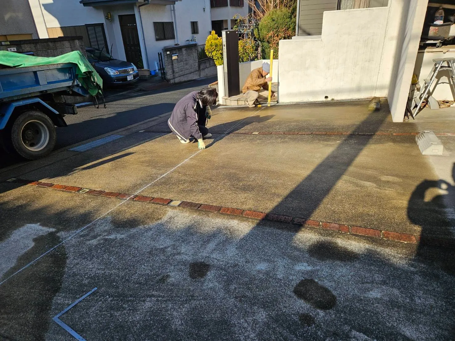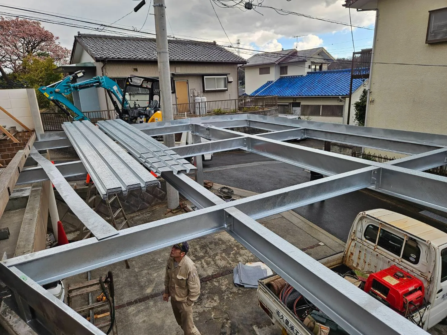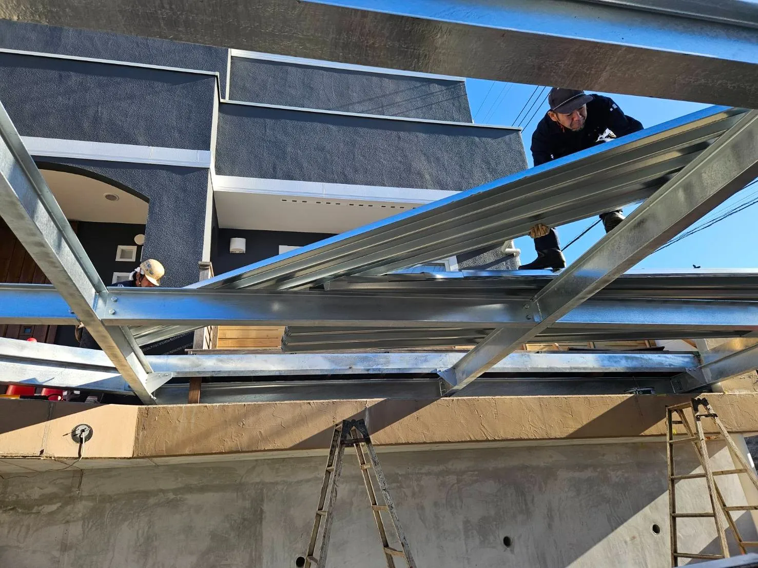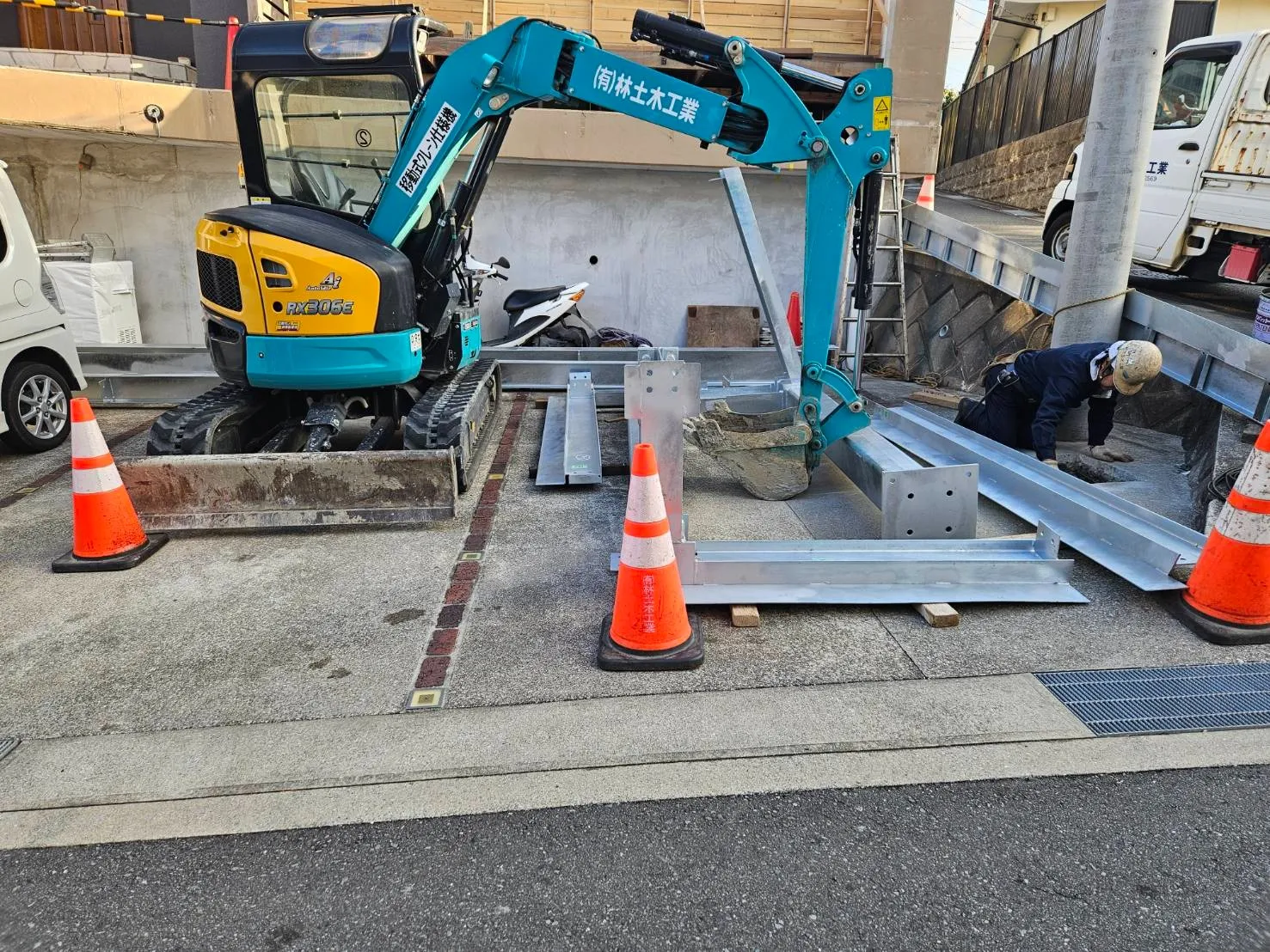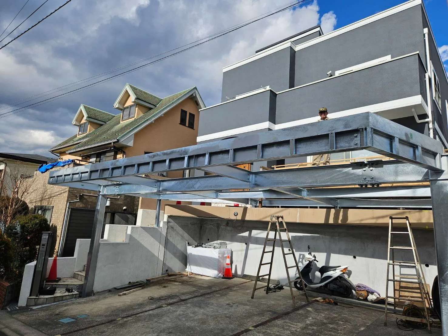 以前塗装工事をさせていただいた顧客様邸の駐車場に、鉄骨でカーポートを造作していきます