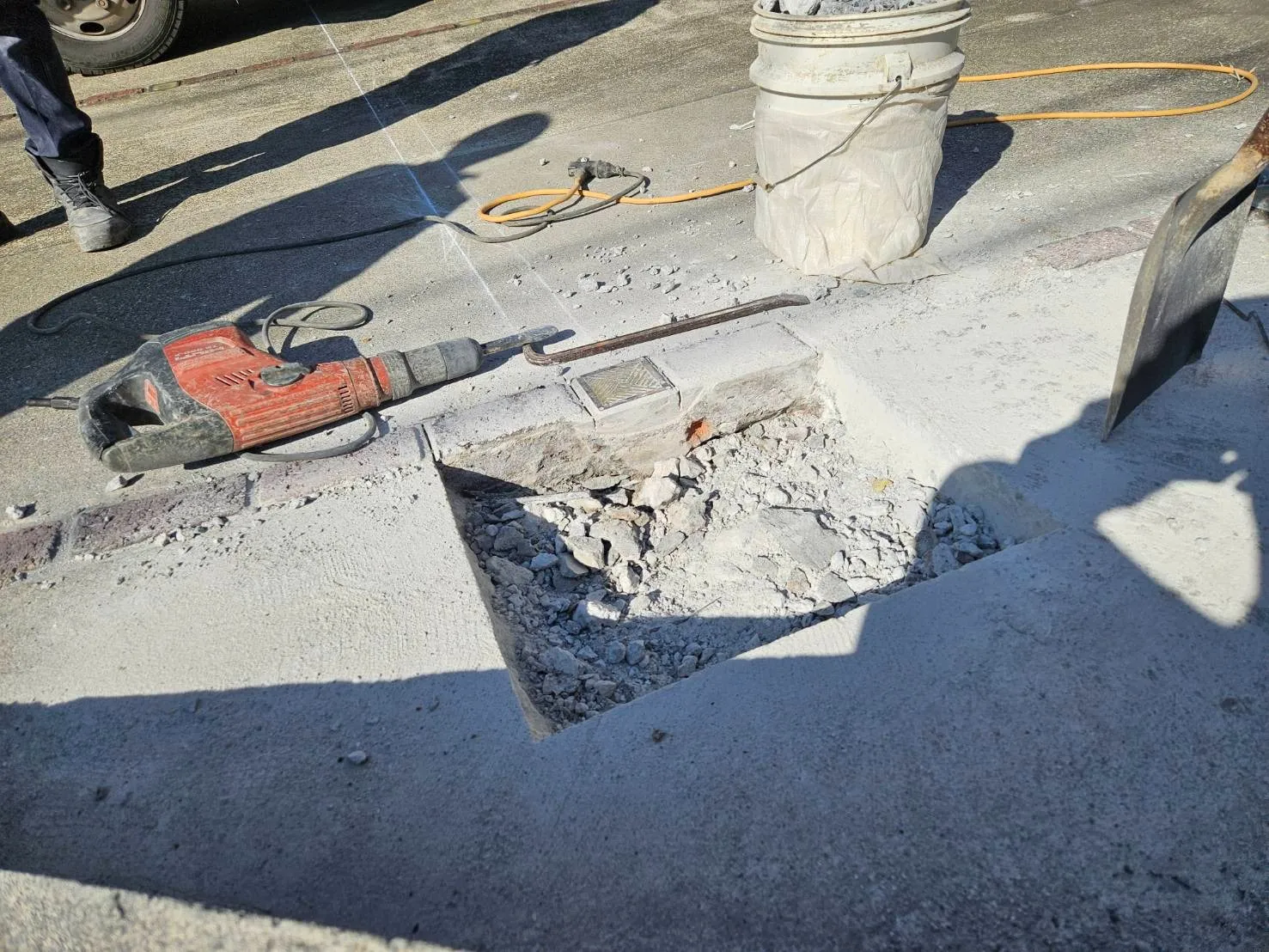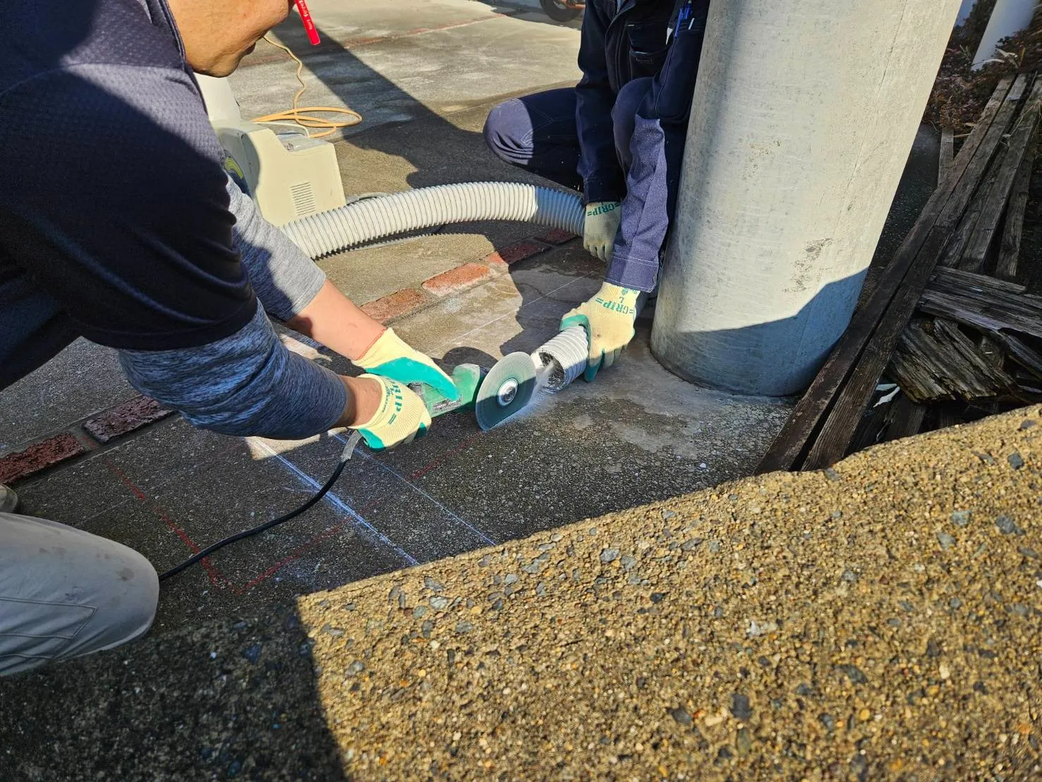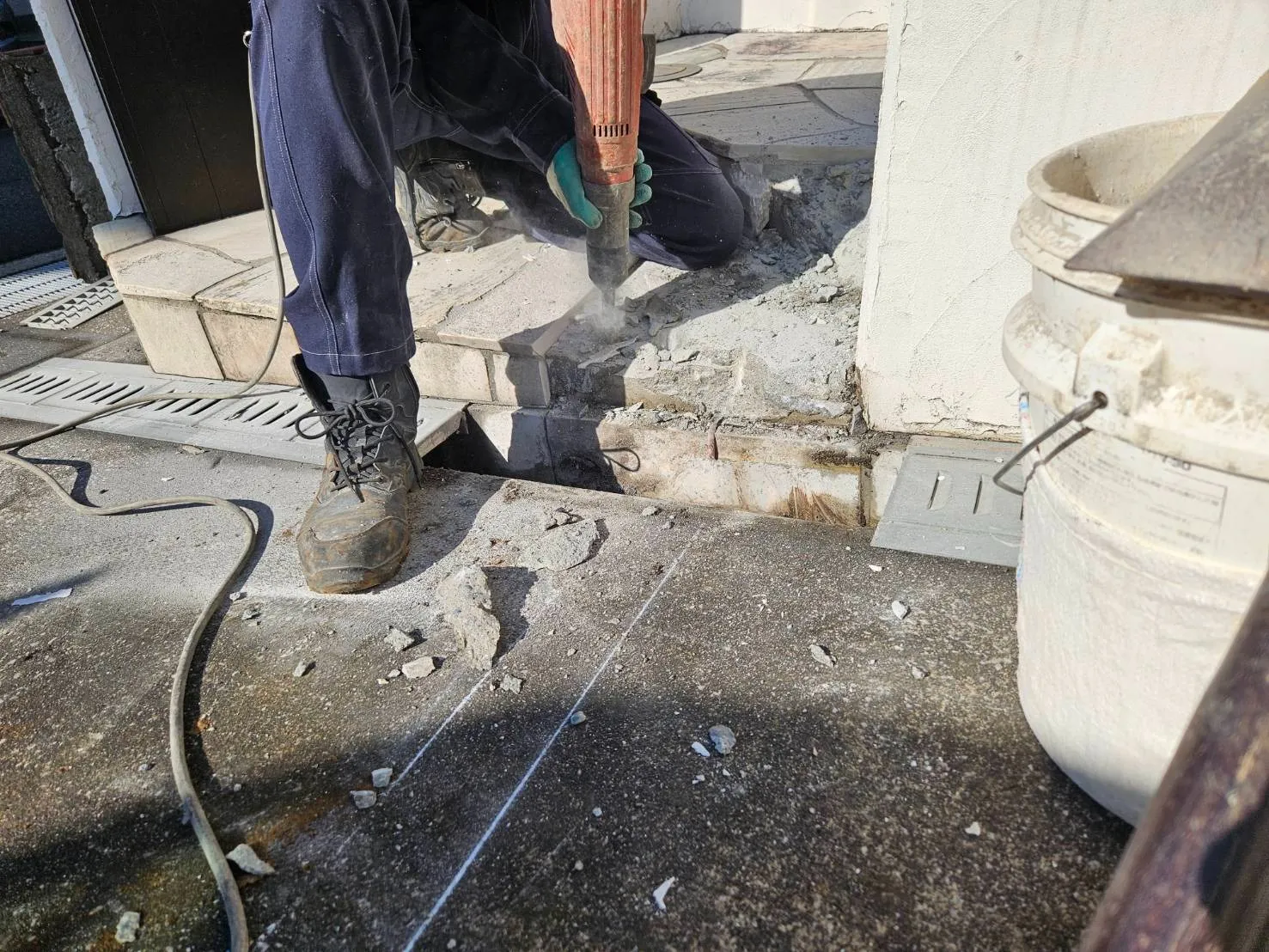 硬い土間をピックで斫ります