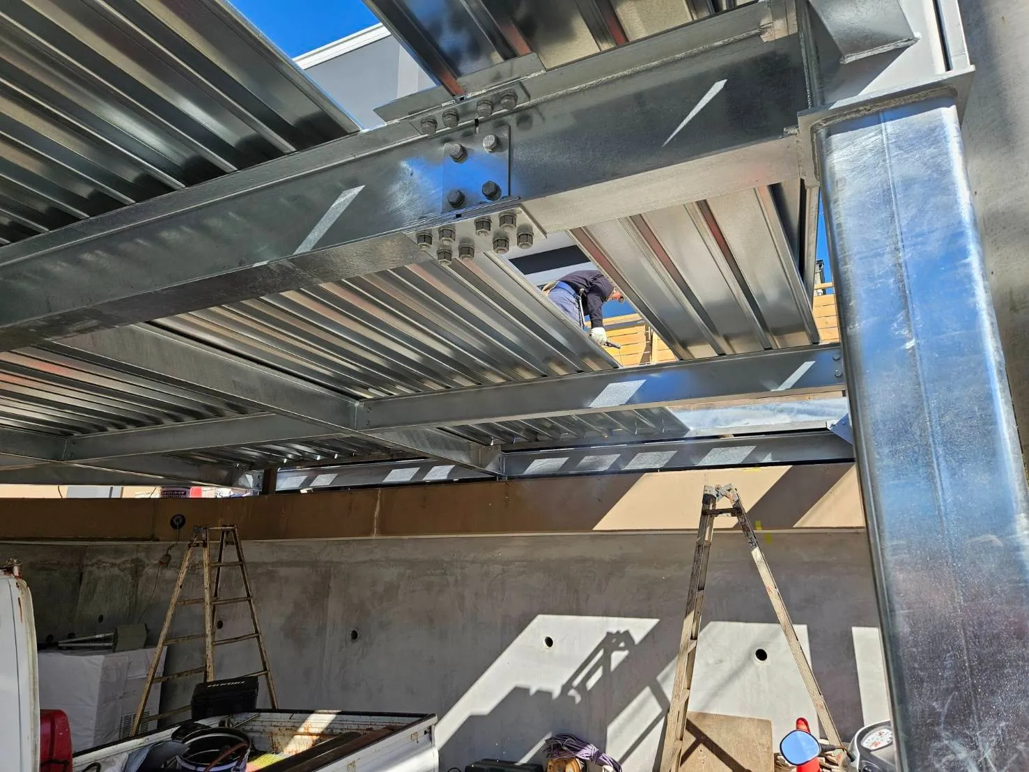 これで、鉄骨の躯体が組み終わりました。接合部をしっかり締め、溶接を施し、鉄骨躯体が完成しました。ここから、屋根の下地のデッキプレートを敷いていきます。